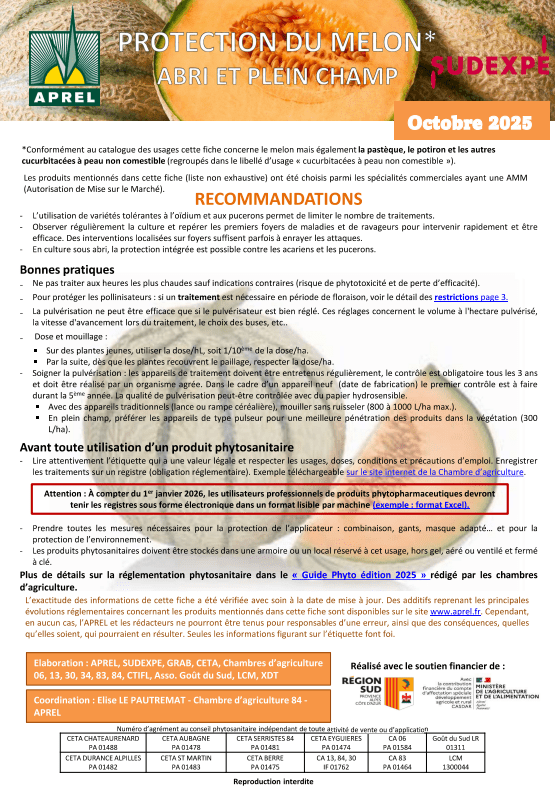 Cette fiche contient des informations sur les méthodes de protection raisonnée pour la culture du melon sous abri et plein champ : prophylaxie, prévention, suivi des cultures, utilisation d’auxiliaires…