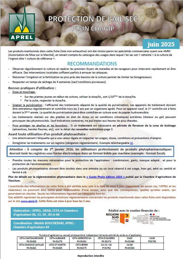 Cette fiche contient des informations sur les mĂ©thodes de protection raisonnĂ©e pour la culture d’ail en plein champ : prophylaxie, prĂ©vention, suivi des cultures, utilisation d’auxiliaires…
