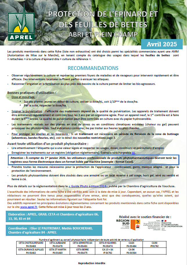Cette fiche contient des informations sur les mĂ©thodes de protection raisonnĂ©e pour la culture de l’Ă©pinard sous abri et en plein champ : prophylaxie, prĂ©vention, suivi des cultures, utilisation d’auxiliaires…