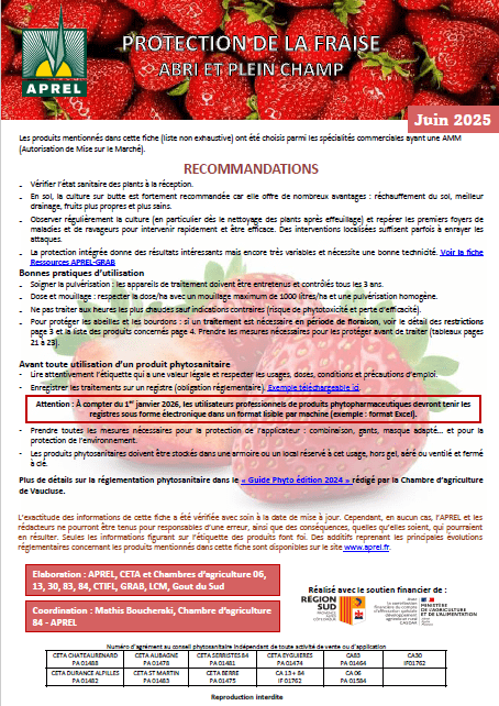 Cette fiche contient des informations sur les mĂ©thodes de protection raisonnĂ©e pour la culture de la fraise sous abri et plein champ : prophylaxie, prĂ©vention, suivi des cultures, utilisation d’auxiliaires…